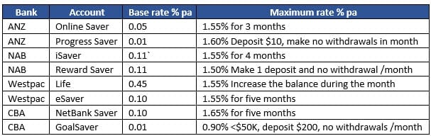 Usually a savings account offers a base rate and a maximum bonus rate that is paid if the account holder meets certain conditions each month. Deposits in bank accounts in Australia are government guaranteed (up to $250,000) so you can consider a savings account one of 'safest' investments you can make.