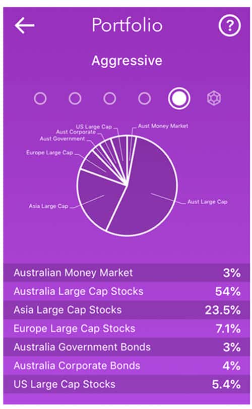 Raiz's aggressive portfolio is dominated by Australian and Asian share holdings. Government and corporate bonds make up a small amount of the total portfolio.